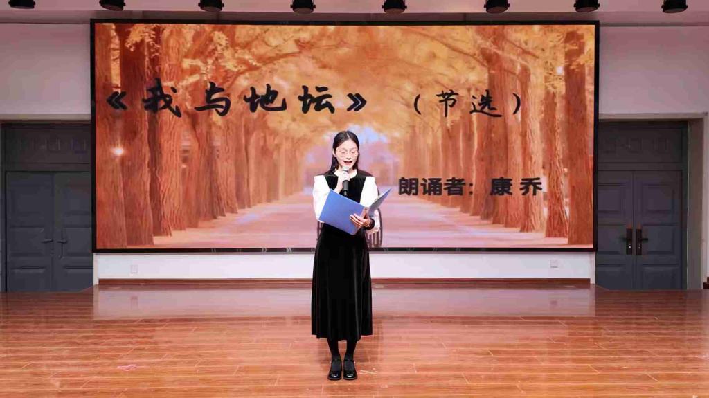 决赛现场,选手们以饱满的热情、真挚的情感,声情并茂地诵读了一篇篇经典散文,展现了他们对文学的热爱和对生活的感悟。其中,康乔同学带来的《我与地坛》深情而动人,史铁生笔下的生命重量在她的演绎下更加震撼人心;王新惠和高辉分别朗诵的《月光下的中国》和《那抹绿》,则以独特的视角和细腻的情感,描绘出祖国山河的壮丽与生机;王娅茹、袁宁静、邢佳乐等同学也不甘示弱,他们的《枯木逢春》等作品同样赢得了现场观众的阵阵掌声。